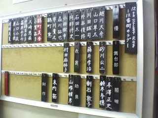 | 早いもんで小屋入りしたと思ったらもう楽日。劇場の着到板をめくるのも最後。 大きな劇場や老舗の劇場には役者の通用口にこのような着到板がある。 来たらメクって帰りもメクって・・・今誰がいるかが一目でわかる。 D.Kにとっては久々の着到板。 何となくこれだけでも役者としてのステイタスが上がったような・・・ ラスト一回いきまっせ ![]() 着到板 |