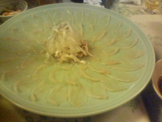 | 今日は、またまたDK応援団M氏の計らいで浦安の‘藤松’さんでふぐ料理のコースをいただきました。 風邪が流行り、気温が上がったり下がったり、疲れがたまってきている今、しっかりと栄養のあるものを食べるのは最も大事な事。ふぐの栄養が骨身に染みます。 いつもありがとうございます 頑張りますね 生ガキ〜 ![]() フグ刺し〜 ![]() フグ鍋〜 |