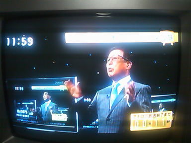 | 本日正午、アナログ放送終了…… やっぱり間に合わなかったぁ 仕方ない、せめて歴史的瞬間を見届けて のんびり考えようと…… 秒読み段階に入り写メを準備。 テレビの中のアナログテレビ達は放送終了の青い画面になっているが、私のテレビ はまだそれを見ている……あれ? もしや時間差攻撃? テレビの時刻は0:13あれれ? 速攻メンバーのアナログ仲間、藤井さんにメールしたらもちろんみれないっすよ! 寂しい〜って…… 家のは未だ3台とも写ってる。 何かラッキーっていうか命拾いしたっていうか……でもきっと何かの間違いだよね。 突然バチッて切れるよね? 電源切ると二度とつかなそうで切るのがコワイ〜 ![]() 歴史的瞬間! ![]() あれっ? |