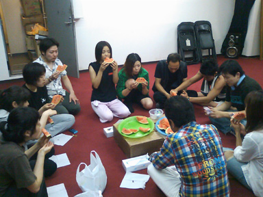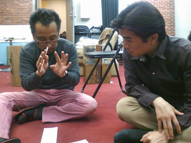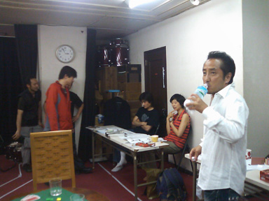 | 今日、最後の稽古場……通し稽古を終えたら荷積みをし、稽古場を去る。 何だか急に不安になりちょっと寂しくなる。 稽古場打ち上げをして劇場入りの段取りを念入りに打ち合わせ…どんどん緊張してくる。 早めに解散し、明日のために体調を整える。 明日の仕込みがスムーズに行き、明後日からの舞台に芝居の神様が微笑んでくれますように…… ![]() 緊張の一息…打ち合わせ |