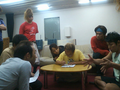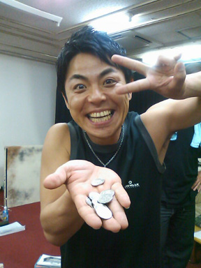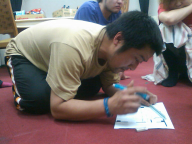 | 今回初めての通し稽古を行った。 しかも、それがスタッフに見せる通しと重なった… スタッフに見せる一番大事な通しがブッツケとは…… まぁ、一回の緊張で済むっちゃあちょっと助かった気もしますが 最初の通しはいつも全員100円持って上演時間をトトカルチョ! 今回の勝者は太一〜!私は2分違い…残念! ![]() 一人占め〜 |