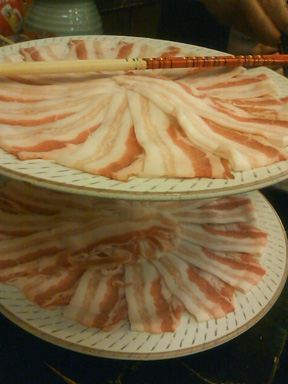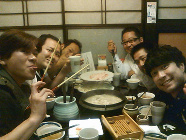 | 今日は我らがD.K 応援団のN氏とO氏が恒例の陣中見舞いに来て下さいました〜! そして、スタジオ近くの黒豚しゃぶしゃぶのお店でコース料理をいただきました〜! ひっさびさに身体にパワーがみなぎりました! かなり食べ過ぎて危険信号が点滅しています。 こんな幸せな気分なのに、台風の影響で後一駅という所で電車の足止めをくらい、 もうかれこれ一時間以上電車の中に… う〜!帰れるのか? ![]() 待ってました〜! ![]() 黒豚しゃぶしゃぶ ![]() 肉で大盛り上がりの男性陣 |
