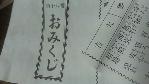 毎年恒例の初詣に行って来ました! そして、楽しみの一つ、おみくじは、去年に引き続き、大吉でした。 やった! 今年もいいぞ! 頑張るぞ! ![]() |