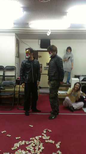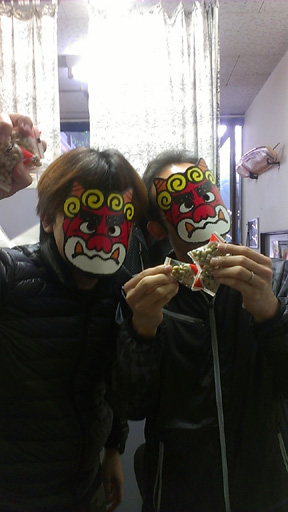 ちょっと早めの豆まき。 スタジオに、ブツブツと文句を言いながら鬼が入って来た! よ〜く聞いてみると、 「俺たちは、一年に一回しか出番がない!」とか、 「豆も最近は散らかるといって、袋入り・・・当たったら痛くてしょうがね〜」とか、 「お面が小さくて片目しか見れね〜」とか・・・ 何ともやる気のない鬼達でした。 でも、鬼さんの登場で、一気に盛り上がり、公演稽古中のスタジオ生も気分転換に なり、私もどさくさに紛れて思いっきり豆を投げたので、ストレス発散させてもらっ ちゃいました。 鬼さん達、お疲れ様でした!! ![]() ![]() ![]() |