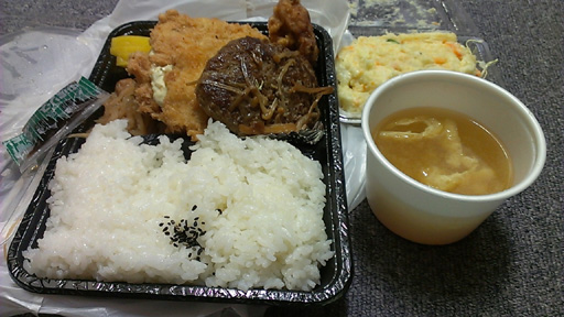 ジャ〜ン! 今日のお昼御飯。 スタジオ近くのお魚やさんで買いました。(って魚入ってないけど・・・) これで550円。全て手作り。三品弁当! おかずは沢山の種類から三品選べてボリューム満点!(蓋もしまりません) 今日は、タルタルチキンと和風ハンバーグとサラダを選びました。 私の活力! もう、元気モリモリです! ![]() |