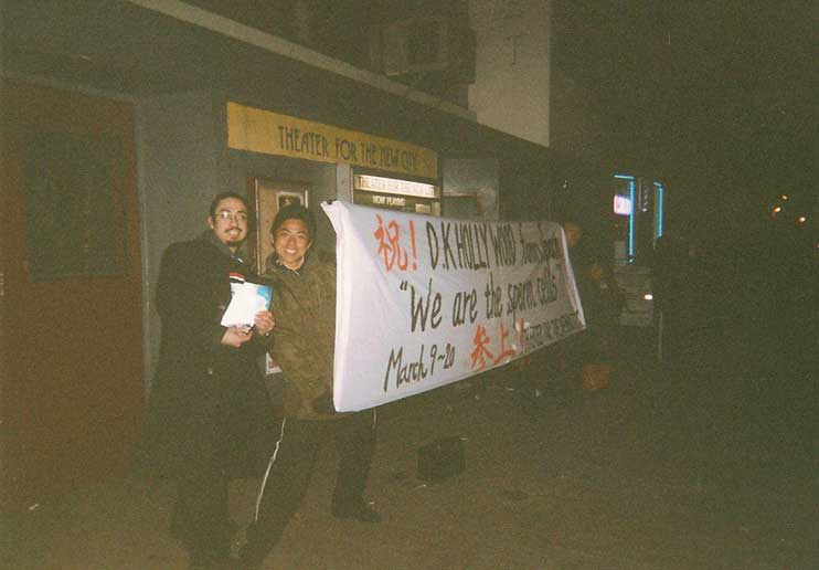 劇場前で最後の宣伝。終いには照明照らして、音楽かけて・・・ここでもミニパフォーマンス? 一緒に写っているのはNYのDKファン第1号。ゴンザレス。通称ゴンちゃん。 彼とは未だにメールをやりとりしています。 |