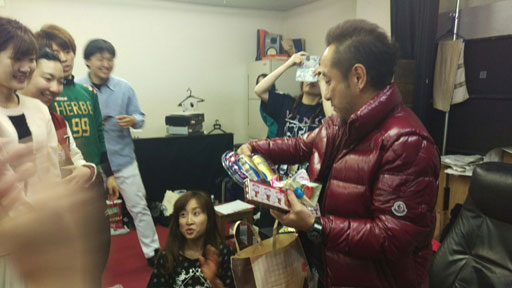 | 帰京翌日はボスのバースデイ 今回の「グロテスクな夜」でのストーリーの如く、 恒例のサプライズを決行! 色々挙がった企画の中から、メンバーのみで走った今年、メンバーの愛情こもった手料理のおもてなしでゆっくりしてもらおうと、某ホテルのスィートルームへご招待。 とっても喜んでもらえました。 やった〜っ! さぁて、来年はどうしよう? ![]() ![]() | |
