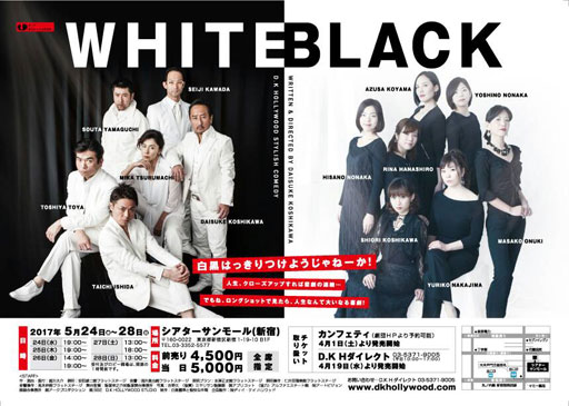 | D.K HOLLYWOOD 最新作の情報をチラ見せ! 新宿シアターサンモールにて、 2017年5月24日(水)〜28日(日) 「WHITE BLACK 」 乞うご期待 ![]() ![]() | |