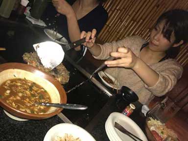 | 稽古終わりに大好きなもんじゃやさんへ。 新人の、沖縄出身で、一度しかもんじゃを食べた事がないという莉奈が、もんじゃを頑張って作っています。 久しぶりのもんじゃ、美味しかった〜! 散々食べて飲んで駅へ向かっていると、行きつけのお店でお世話になった店長を発見! 寄っちゃうよね〜〜 ![]() ![]() | |