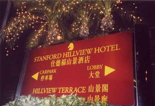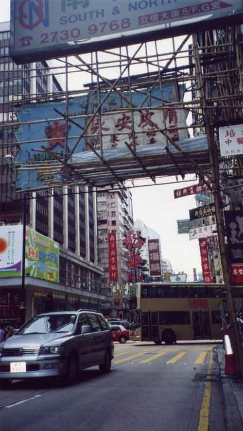 | 香港の街には看板がつきもの。その看板や建物に竹の足組みが・・・ どんな高層ビルでも、ここ香港の足場は竹と縄で組みたてているんだって。 |
