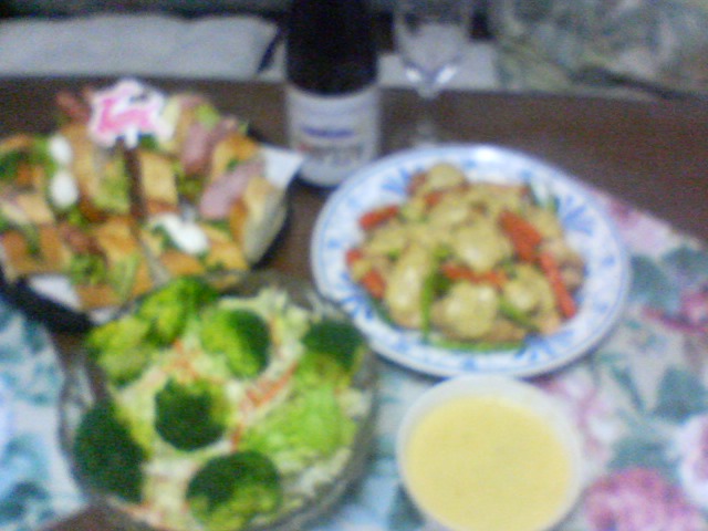 | 今日は昼間出かけて、帰りが珍しく早かった。 夕方私が家にいられるのは約50日振り。 ようし、クリスマスも近いし久しぶりにママとパパにクリスマス気分を味わってもらおう。 って事で久しぶりの家でのディナー。 遅ればせながらのボジョレーをあけてパリジャンサンド、コーンクリームスープ、サラダ、チキングリルのマヨマスタードソース和え。 6時前には夕食終了・・・早え〜!ちょっと健康的すぎ? ![]() 色彩りがかぶってる? |