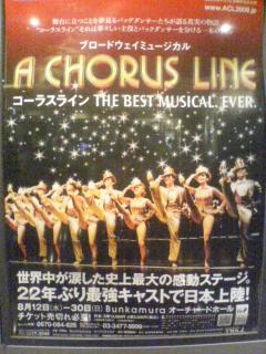 | 今日、仕事の合間にコーラスラインを観て来ました。 久しぶりのミュージカル!しかもブロードウェイキャスト! 千秋楽まであと2日という事で空いてる席が3階席のみだって・・・真っ逆さまに落ちそうなバルコニー席から観劇しました! 見事なダンスに歌・・・残念ながらこの席からは役者の表情は全く見れない。 この作品を観るのは二回目、それに映画に本・・・内容はもちろん、細かいセリフまで覚えている所もある。でも字幕があるとどうしても目がいっちゃうんだよね?そうすると役者の動きやバックのダンスを見逃しちゃうんだよね? う〜ん舞台の字幕・・考えものです・・・ でも、しっかりと鳥肌が立つ感動と刺激はもらいました! 大満足!ブラボーでした!!