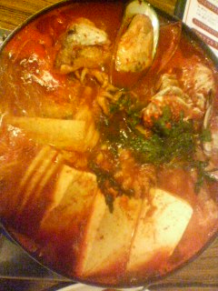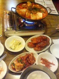 | 今日は、デトックスデイ! 最近浮腫みのせいにしている体重増加を何とかしなければ・・・ ということで、コリアンパワーを借りることに・・・ ミストサウナ、麦飯石サウナ、アカスリ、よもぎ風呂etc・・・ 4時間コースをみっちり堪能。でも友達と話しているとまだ足りない。 全身から色んなものが出た気がして超スッキリ! わーい体が軽くなったよ〜 さすがにいい感じで喉が渇いてきた・・・・・ 「ここで我慢しなきゃだめでしょ!」って遠くから聞こえる。 え〜い遅いもんね〜体はすでに韓国人ばかりで賑わいでいる、とっておきのお店にIN! ちょっと涼しくなってきたから鍋もいいんでな〜い? 趣向を変えて味付きチキンもいいんでな〜い? って・・・・またしても失敗?・・・ でも、身も心もスッキリしたし、何よりも美味しかったーー!! ええんでな〜い? ![]() 海鮮鍋〜 |
