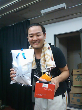 | 本番中日の今日、誕生日を迎えた幸せ者がいます。D.Kのムードメーカー石田太一! 舞台稽古を装って、スタッフにも協力してもらい、いきなりのサプライズBirthday 海が大好きな太一にバスタオルとビーチサンダルのプレゼント よっしゃ!今日は昼も夜もDVD撮影があるから失敗は出来ません。 過去の確率的に言うと、撮影の時に限ってあり得ない失敗をやらかしてしまっている… 珍しく、出だし順調だった私…今日こそやらかしてしまいそうな予感…。 ![]() 舞台上で… ![]() 本日お誕生日! |