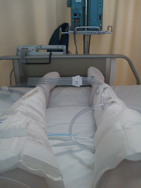 | 手術は朝一。5時30分から準備にかかった。 手術室に運ばれる前に飲む、麻酔を誘導するためのシロップで簡単に堕ちてしまったらしく、その後行う、懸念していた背中からの硬膜外麻酔の時はすでにイチコロ…… 何て単純なんでしょう。 お昼過ぎ、無事手術を終え、ナース室の奥の部屋に移された。今日一日はここで過ごすらしい。 足にはターミネーターのような装置が術前から取り付けられ、圧をかけ伸縮させて刺 激を与え、血栓が出来ないようにして体に流すらしいのですが、結局は足のマッサー ジ機。しかもいつもは膝下しかやった事なかったけれど、足首から腿の付け根までの 広範囲を1日中。 傷口の痛みもなく、音楽を聞きながら 術後とは思えない想定外の一日でした。 不思議な程、全く痛みを感じない事に感謝 ![]() 足に装着されたマシン… |