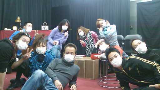 | 只今、東京と神奈川でインフルエンザがかつてない猛威を奮っている!との事で、私 達の稽古場でも、自分の出番以外のマスクの着用、うがい・手洗いを義務付けられ ました。 まじ恐いです! ここで誰か一人でもインフルエンザにかかってしまったら… 本番が終わるまで、気を張って頑張ります! そんなこんなで稽古終わり、久々に皆で栄養を付けに、中華を食べに行きました! まいう〜! ![]() 変な集団…インフルエンザ予防! ![]() |