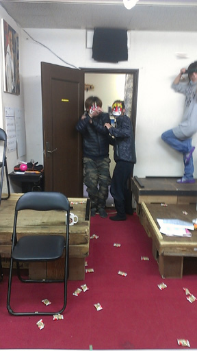ちょっと早めの豆まき。 スタジオに、ブツブツと文句を言いながら鬼が入って来た! よ〜く聞いてみると、 「俺たちは、一年に一回しか出番がない!」とか、 「豆も最近は散らかるといって、袋入り・・・当たったら痛くてしょうがね〜」とか、 「お面が小さくて片目しか見れね〜」とか・・・ 何ともやる気のない鬼達でした。 でも、鬼さんの登場で、一気に盛り上がり、公演稽古中のスタジオ生も気分転換に なり、私もどさくさに紛れて思いっきり豆を投げたので、ストレス発散させてもらっ ちゃいました。 鬼さん達、お疲れ様でした!! ![]() ![]() ![]() |