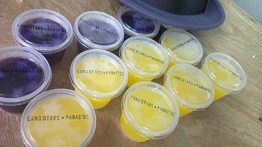 いつもスタジオに手作り差し入れを持って来てくれる悦代さんが、今回も差し入れを持って来てくれました。 グレープとオレンジのゼリー。 カップには、ギャングスターズ☆パラダイスの文字が! 凝ってますね〜! 美味しくいただきました!悦代さん、ありがとう! ![]() |